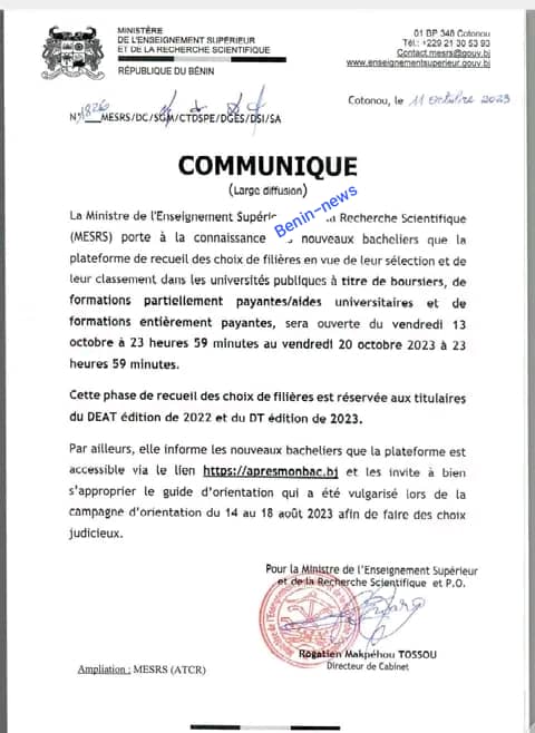 Le ministère de l’enseignement supérieur et de la recherche scientifique à travers un communiqué en date du mercredi 11 octobre 2023 signé du Directeur de Cabinet Rogatien Mapkéhou Tossou porte à la connaissance des nouveaux bacheliers que la plateforme de recueils des choix en vue de leur sélection et de leur classement dans les universités publiques à titre de boursiers, de formation partiellement payantes/ aides universitaires et de formations entièrement payantes, sera ouverte du vendredi 13 octobre à 23 heures 59 minutes au vendredi 20 octobre 2023 à 23 heures 59 minutes. Le choix sera opérationnel sur la plateforme est https/apresmonbac.bj