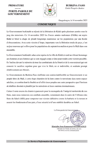 La junte Burkinabè n’est pas restée indifférente suite à l’annonce de la libération de la ville de Kidal après plusieurs années sous le joug terroriste au Mali. Dans un communiqué en date de ce mardi 14 novembre 2023 signé du porte-parole du gouvernement, le régime militaire au Burkina Faso salue la prise de la ville de Kidal des mains des terroristes et rend un hommage aux hommes et aux femmes qui se sont engagés corps et âme pour rendre cette victoire possible. Le gouvernement Burkinabè s’incline également devant la mémoire de tous les combattants de la liberté et de la souveraineté qui ont consenti le sacrifice suprême pour que vive le Mali, un et indivisible et souhaite prompt rétablissement aux blessés.