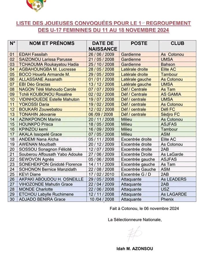 La Fédération Béninoise de Football a dévoilé la liste des jeunes prodiges sélectionnées pour le premier regroupement des U-17 féminines, prévu du 11 au 18 novembre 2024. Sous la conduite inspirée de la sélectionneure nationale, Idah M. Azonsou, ce rassemblement marque le coup d’envoi d’une campagne décisive pour les éliminatoires de la Coupe du Monde Féminine U17. Ce stage de préparation, véritable test de caractère et de talent, offrira aux joueuses l’occasion de démontrer leur engagement et de se positionner en tant que piliers d’une équipe ambitieuse. L’encadrement technique axera son travail sur l’unité du groupe et la rigueur tactique, afin de construire une équipe capable de rivaliser avec les meilleures nations du football féminin africain.Idah M. Azonsou, connue pour son expertise et sa capacité à galvaniser ses équipes, a insisté sur l’importance de la détermination et du travail acharné lors de ce premier regroupement. « Chaque joueuse doit comprendre l’enjeu : c’est le moment de prouver que le Bénin peut compter sur elles pour écrire une nouvelle page de notre histoire footballistique », a-t-elle déclaré. Pour ces jeunes Amazones, le rêve mondial commence ici, dans ce premier camp où l’effort, le talent et la passion pour le maillot vert-jaune-rouge seront les clés pour forger une équipe compétitive et prête à conquérir l’Afrique. Ci-dessous la liste des joueuses convoquées.