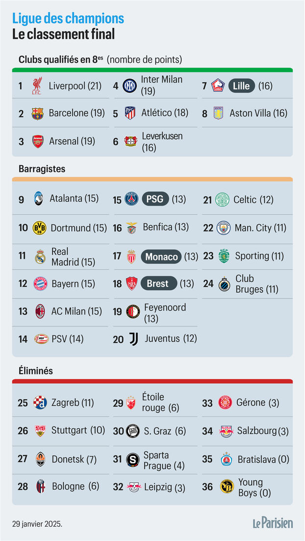 Le nouveau format de la Ligue des champions a tenu toutes ses promesses : plus d’équipes, plus de matchs, des scénarios à foison, et un suspense haletant jusqu’à la dernière seconde. Après un multiplex riche en rebondissements, le classement final de cette phase de poules est désormais connu, ainsi que ses implications pour la suite de la compétition.