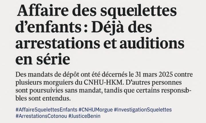 L’affaire des squelettes d’enfants découverts derrière la clôture du Centre national hospitalier et universitaire Hubert Koutoukou Maga (CNHU-HKM) connaît une évolution majeure. Lundi 31 mars 2025, la Cour de répression des infractions économiques et du terrorisme (CRIET) a franchi un cap en plaçant sous mandat de dépôt plusieurs suspects après des investigations approfondies.