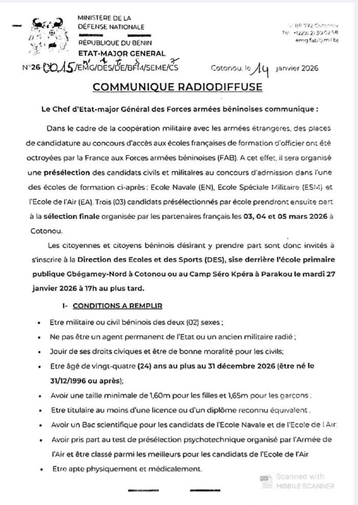 Selon un communiqué du Chef d’État-major Général, une phase de présélection nationale sera organisée afin de retenir trois (03) candidats par école. Les candidats présélectionnés prendront ensuite part à la sélection finale conduite par les partenaires français, prévue les 03, 04 et 05 mars 2026 à Cotonou.