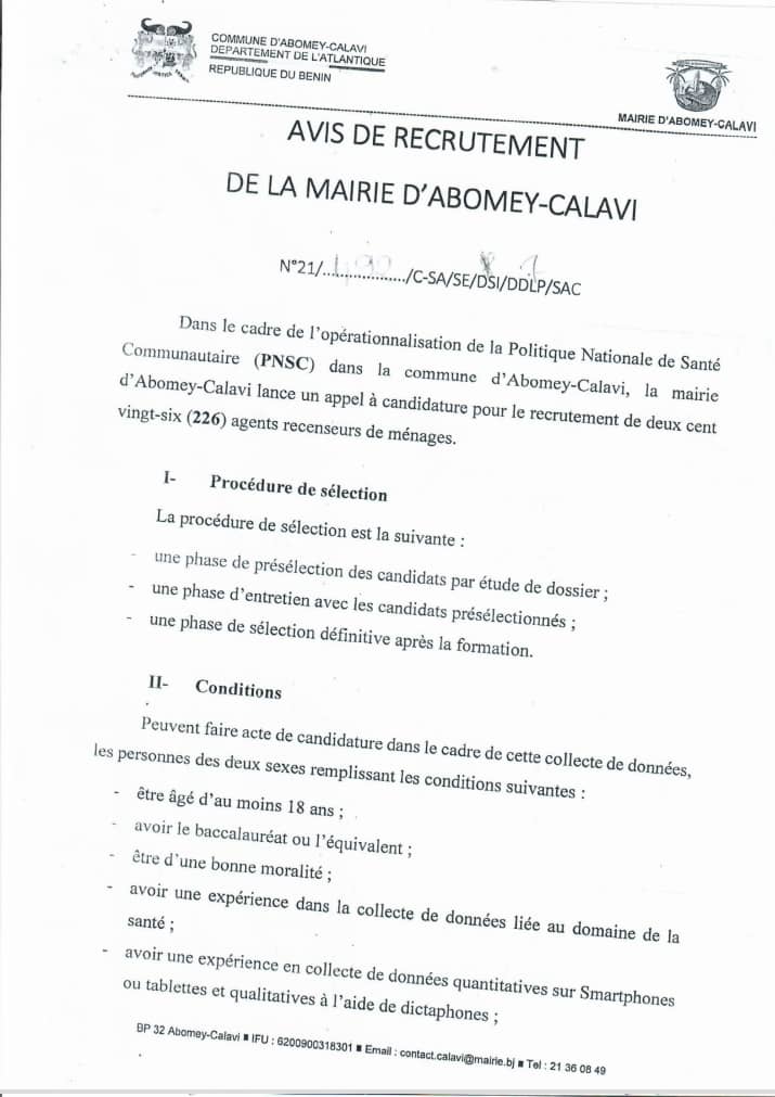 La mairie d’Abomey -Calavi recrute 226 agents recenseurs dans le cadre de l’opérationnalisation de la Politique Nationale de Santé Communautaire (PNSC) dans la commune d’Abomey-Calavi.