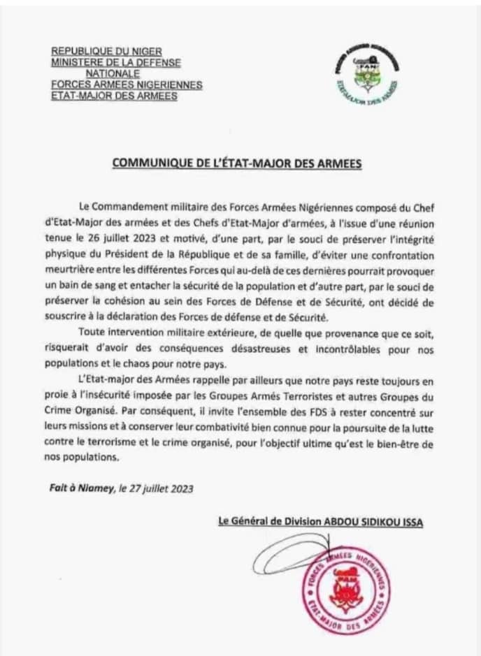 Niger: l’armée rejoint les putschistes International By Bénin News Last updated Juil 27, 2023 0 591 Share Dans un communiqué publié en date de ce jeudi 27 juillet 2023, le commandement militaire a décidé de “souscrire” à l’action des putschistes. Related Posts France : un Tunisien abattu après une attaque au couteau Sep 3, 2025 Marseille : gratuité des transports en commun pour les… Sep 2, 2025 Scandale dans une multinationale : le DG limogé pour… Sep 2, 2025 Ci dessous l’intégralité du communiqué Niger 0 591 Share