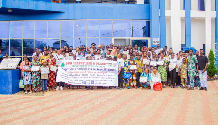 L’Ong Happy Life and Peace Bénin, comme à son habitude a encore fait de nouveaux heureux le week-end écoulé. Il s’agit d’une centaine de récipiendaires qui ont reçu leurs parchemins le samedi 12 août 2023 dans locaux de la Bibliothèque “Bénin Excellence” de Zogbadjè sous la houlette du C.A de l’arrondissement d’Abomey-Calavi, Franck Doho, parrain de la 10e promotion du programme “Zéro analaphabet du 3e millénaire”. Un vaste programme de formation qui a duré quatre mois et a été placé sous le signe : “Égalité des sexes à l’accès au numérique”, dans plusieurs arrondissements d’Abomey-Calavi, Ouidah et Tori-Bossito. Pour le parrain de la promotion, c’est une merveilleuse initiative qui mérite d’être encouragée et accompagnée. Il a remercié le Président de l’Ong Happy Life and Peace Bénin qui a vu juste en initiant ce programme au profit de la jeunesse. “L’informatique est un secteur qui est en perpétuelle évolution” a-t-il fait remarquer. À l’endroit des jeunes récipiendaires il a souhaité qu’ils fassent bon usage des attestations reçues en renforçant leurs acquis dans le bon sens et non en végétant dans la cybercriminalité. “Je voudrais compter sur vous que vous n’allez pas faire le choix de la cybercriminalité mais le choix de décrire des programmes pour nous, de décrire des algorithmes pour nous, des applications pour régler les problèmes auxquelles nous sommes confrontés dans nos entreprises au quotidien” a-t-il lancé à l’endroit des récipiendaires. Pour sa part le président de l’Ong Happy Life and Peace Bénin Ulrich Tiomon a félicité les heureux du jour. Il n’a pas manqué de présenter l’Ong dont il a la charge. Laquelle intervient dans plusieurs domaines dont la formation, la protection de l’environnement, le social, etc.