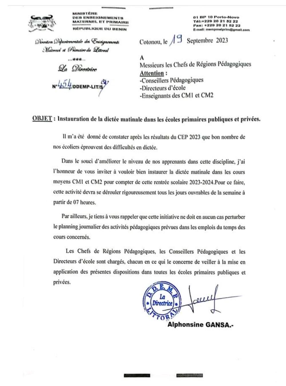Bonne nouvelle pour les parents d’élèves du département du Littoral. la dictée matinale qui jadis réhaussait le niveau des enfants des cours primaires et qui faisait même échec à l’examen en cas d’obtention de la note 00 est désormais de retour dans les habitudes. La Directrice départementale des enseignements maternel et primaire du Littoral Alphonsine Gansa, via une note à l’endroit des chefs régions pédagogiques instaure la dictée matinale dans les écoles primaires publiques et privées du Littoral. Elle est partie du constat qu’après les résultats du Cep 2023, “bon nombre des écoliers éprouvent des difficultés en dictée”. C’est donc pour améliorer le niveau de ces derniers dans cette discipline, qu’il est désormais instauré la dictée matinale dans les cours moyens CM1 et CM2 tous les jours ouvrables de la semaine, à partir de 7h pour compter de cette rentrée scolaire 2023-2024.