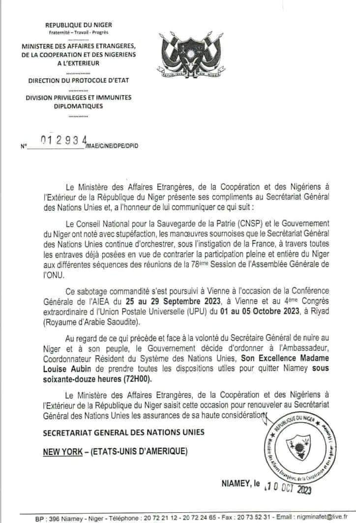 Niger et à son peuple», le Gouvernement nigérien décide «d’ordonner à l’Ambassadeur, Coordonnateur Résident du Système des Nations Unies, Son Excellence Madame Louise Aubin de prendre toutes les dispositions utiles pour quitter Niamey sous soixante-douze heures (72H00)».