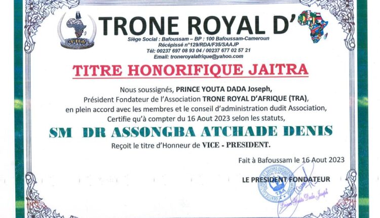 And on the honorary title it is written: «We, the undersigned, Prince Youta DADA Joseph, Founding President of the TRONE ROYAL D’AFRIQUE (TRA) Association, in full agreement with the members and the board of directors of the said Association, certify that from August 16, 2023 according to the statutes, SM Dr ASSONGBA Atchadé Denis receives the honorary title of Vice-President ».