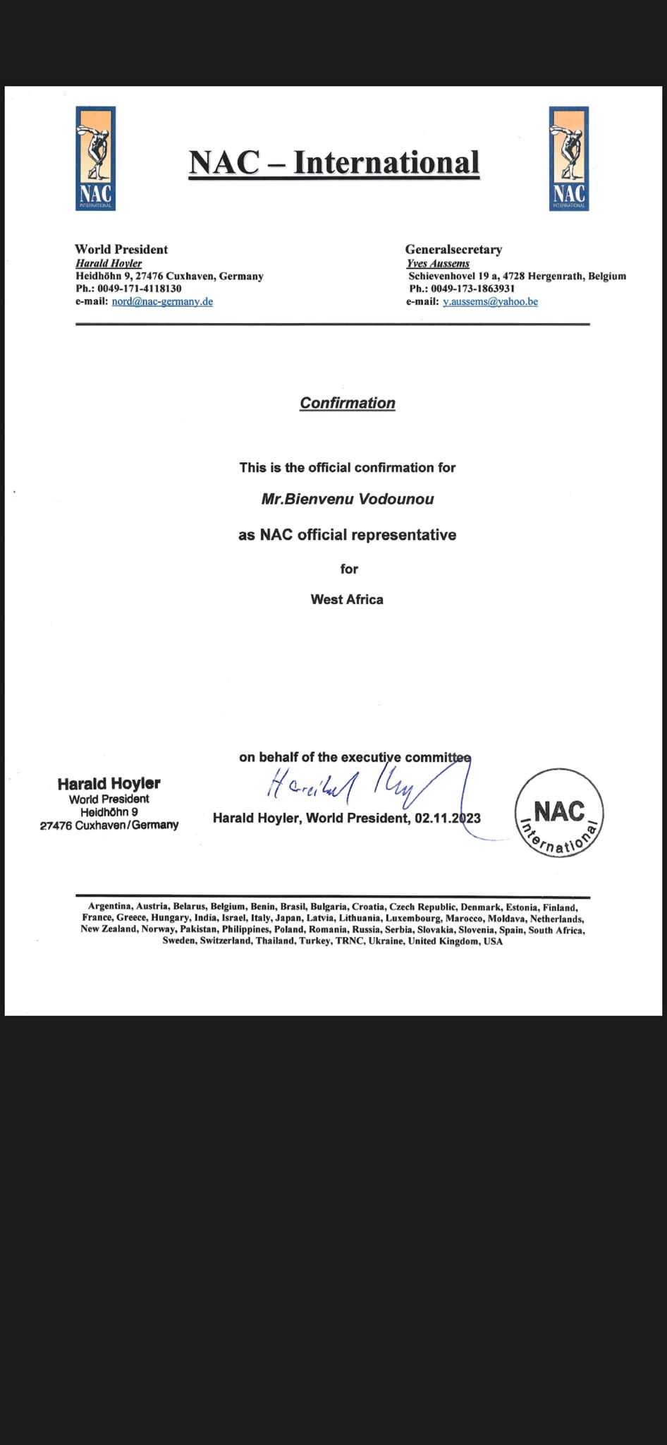 Pour son engagement et sa bonne gestion du bodybuilding au Bénin, Bienvenu VODOUNOU vient de bénéficier de la confiance du NAC-INTERNATIONAL, la faîtière allemande qui organise des compétitions nationales et internationales de bodybuilding et qui développe de vastes politiques de promotion de la discipline dans plusieurs pays dans le monde.