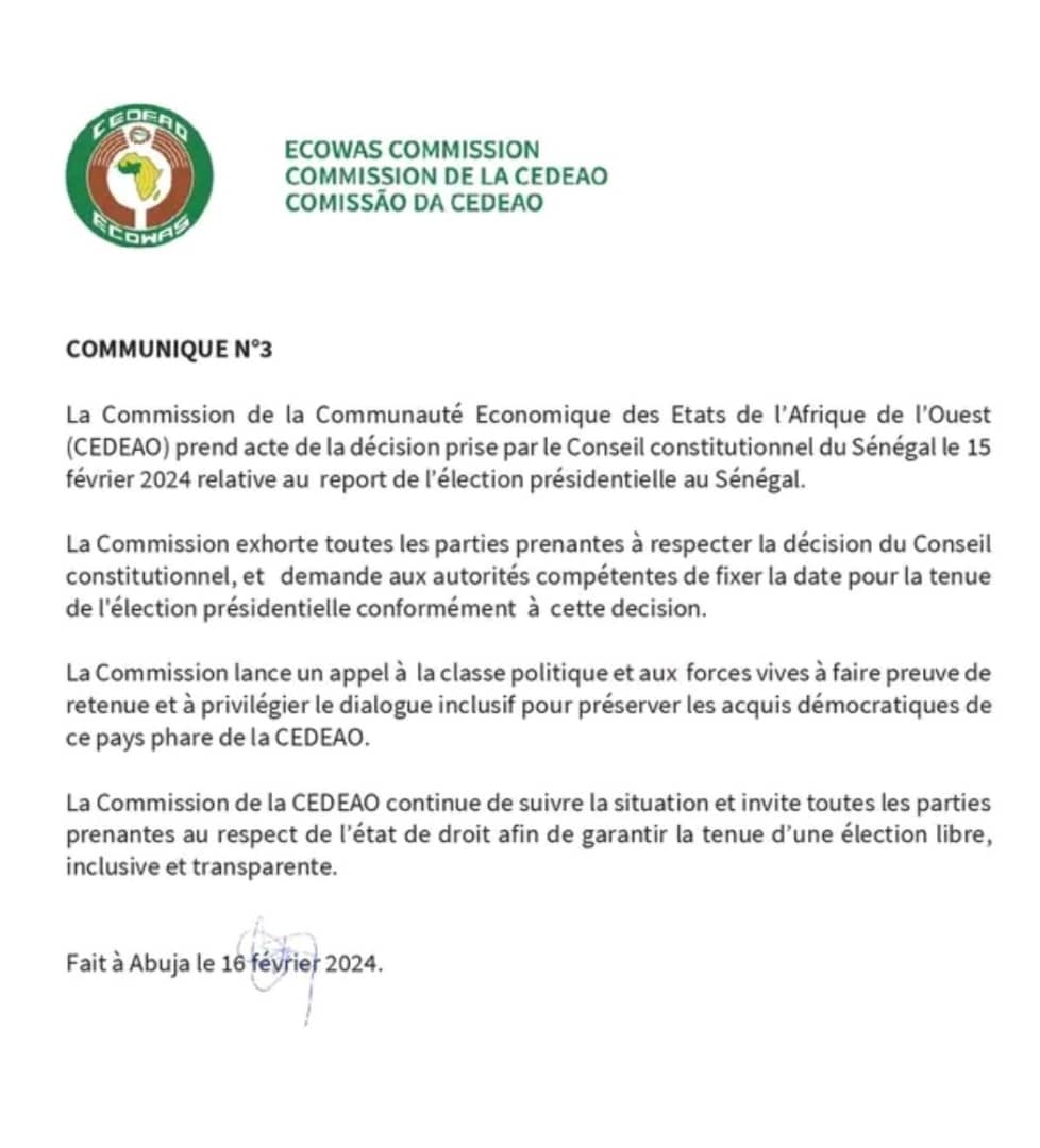 La Cedeao a réagi suite à la décision du Conseil constitutionnel du 15 février 2024 qui annule le report de la présidentielle au Sénégal. L’institution sous-régionale invite Macky Sall à fixer une nouvelle date pour la présidentielle en suivant les injonctions du Conseil constitutionnel