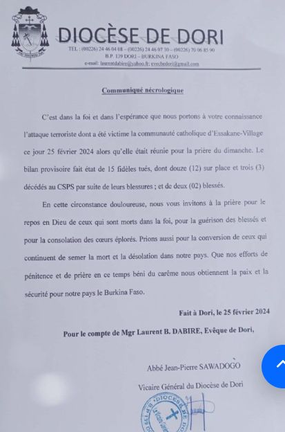 Au Burkina-Faso, des assaillants ont perpétrés une attaque terroriste contre une église catholique ce dimanche 25 février 2024. Selon le communiqué publié par le Diocèse de Dori et signé de Monseigneur Laurent D. DABIRE, le bilan provisoire fait état de 15 fidèles tués par des terroristes.