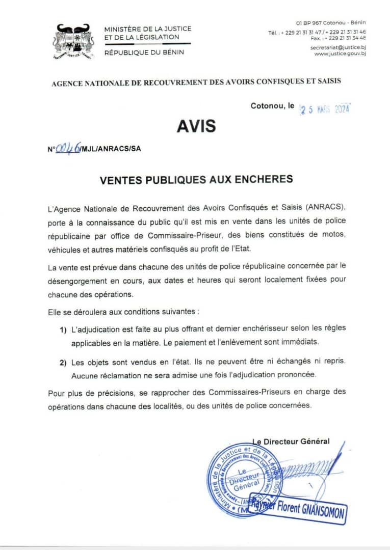 A travers un Avis, le Directeur général de l’Agence nationale de recouvrement des avoirs confisqués et saisis (ANRACS), Raynier Florent Gnansomon informe le peuple béninois qu’il est mis en vente dans les unités de police républicaine par office de commisaire-priseur, de biens constitués de motos, véhicules et autres matériels confisqués au profit de l’Etat.