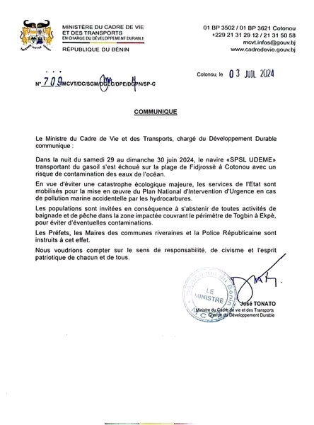 Dans un communiqué en date de ce mercredi 03 juillet 2024, le ministre du cadre de vie et des transports chargé du Développement durable informe de ce que, dans la nuit du samedi 29 au dimanche 30 juin 2024, le Navire ” SPSL UDEME” transport du gasoil s’est échoué sur la plage de fidjrossè à Cotonou avec un risque de contamination des eaux de l’océan. C’est pourquoi les populations sont invités en conséquence à s’abstenir de toutes les activités de baignade et de pêche dans la zone impactée couvrant le périmètre Togbin à Ekpè pour éviter d’éventuelles contaminations.