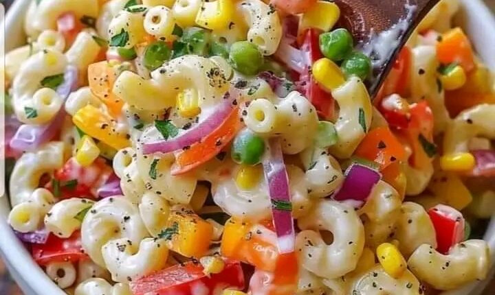 - Dans un grand saladier, mélangez les macaronis refroidis avec les légumes coupés, le maïs et les petits pois.