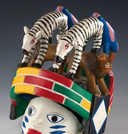 Le masque du caméléon : Il représente l’adaptabilité et la prudence. Dans la tradition Yoruba, le caméléon est respecté pour sa capacité à observer et à changer de couleur selon les circonstances. Ce masque enseigne l’importance de s’adapter tout en restant fidèle à ses valeurs.