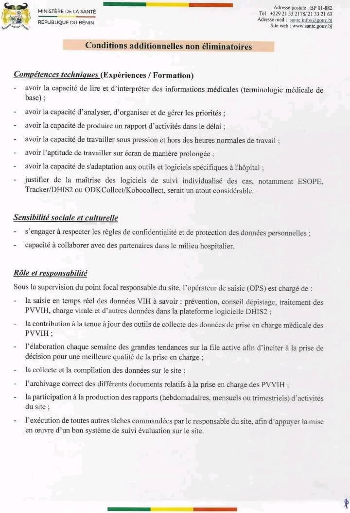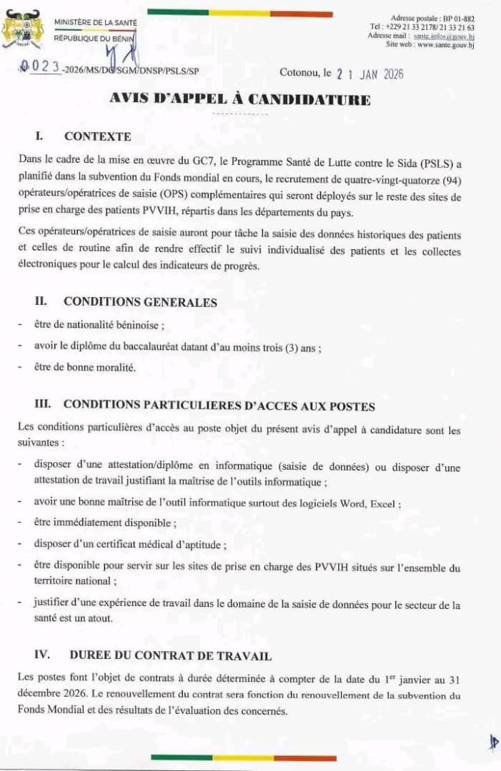 Dans le cadre de la mise en œuvre de la subvention GC7 du Fonds mondial, le Ministère de la Santé du Bénin, à travers le Programme Santé de Lutte contre le Sida (PSLS), lance un appel à candidatures pour le recrutement de quatre-vingt-quatorze (94) Opérateurs/Opératrices de Saisie (OPS).