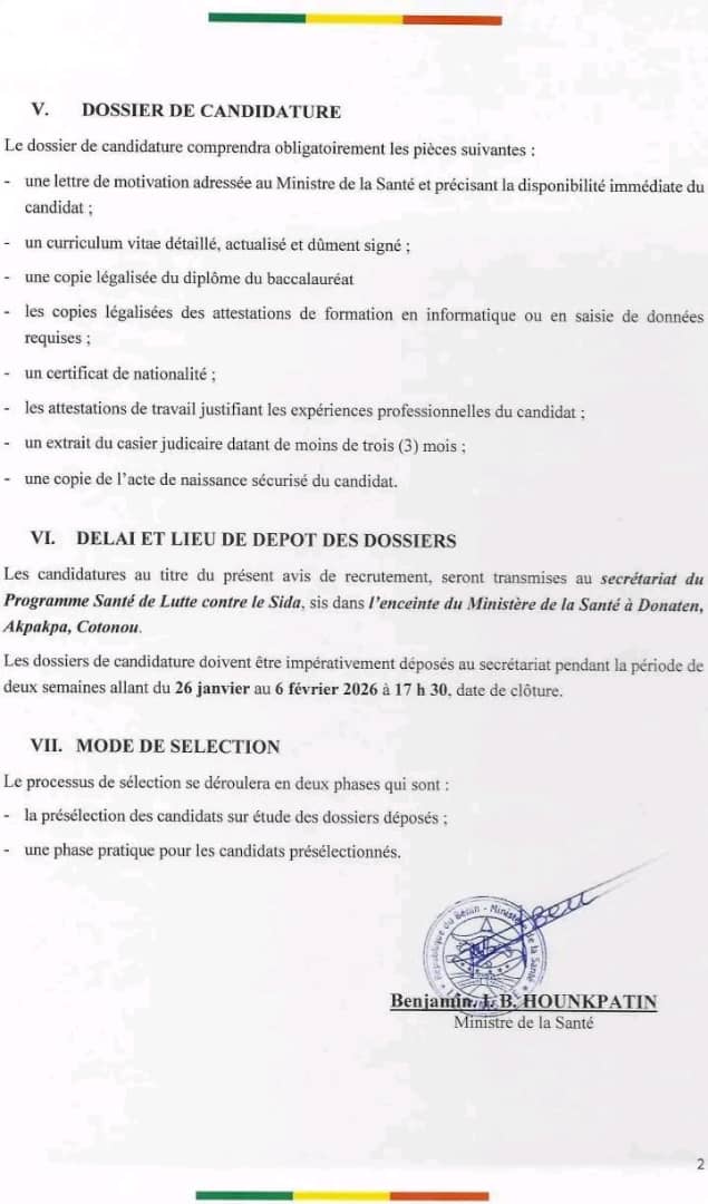 Les dossiers de candidature doivent être déposés au Secrétariat du PSLS, Ministère de la Santé, Donaten (Akpakpa – Cotonou)