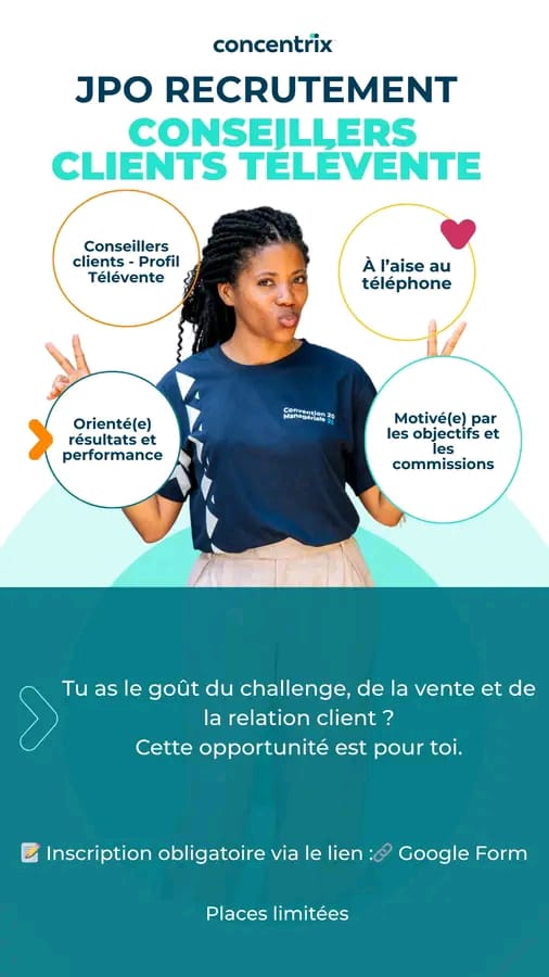 Concentrix Bénin organise une Journée Portes Ouvertes (JPO) dédiée au recrutement de Conseillers Commerciaux en Télévente. Cette initiative vise à offrir une opportunité aux candidats motivés de découvrir les métiers de la télévente et d’intégrer un environnement professionnel dynamique et orienté performance.