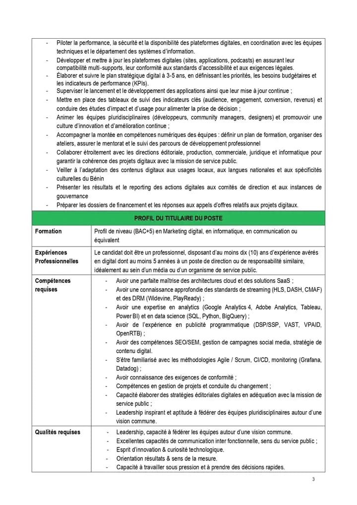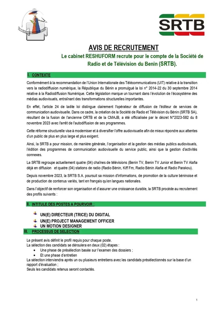 Le cabinet RESHUFORM recrute pour le compte de la Société de Radio et de Télévision du Bénin (SRTB S.A.), dans le cadre de la réforme de la radiodiffusion numérique et du renforcement de son organisation interne.
