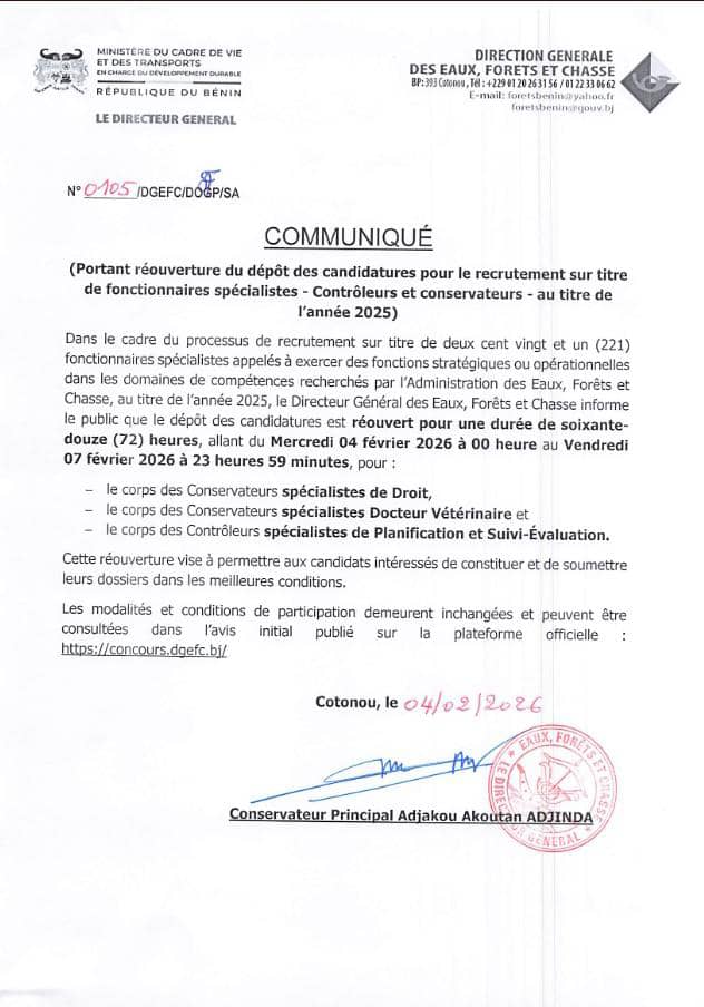 La Direction Générale des Eaux, Forêts et Chasse (DGEFC) a annoncé la réouverture du dépôt des candidatures dans le cadre du recrutement sur titre de 221 fonctionnaires spécialistes au titre de l’année 2025.