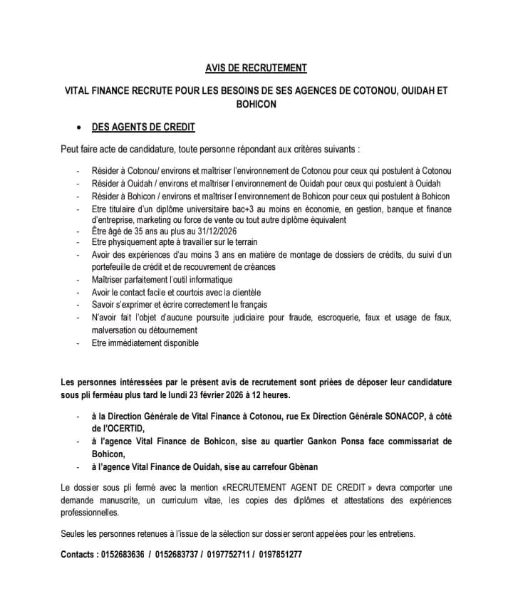 Les dossiers de candidature (demande manuscrite, CV, copies de diplômes et attestations d’expériences) doivent être déposés sous pli fermé avec la mention « Recrutement Agent de Crédit » au plus tard le lundi 23 février 2026 à 12h dans les agences de Vital Finance à Cotonou, Bohicon ou Ouidah.