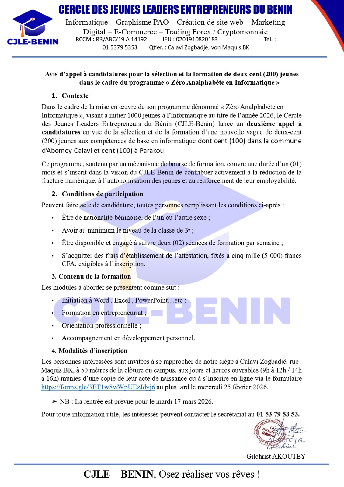 Dans le cadre de la mise en œuvre de son programme « Zéro Analphabète en Informatique », le Cercle des Jeunes Leaders Entrepreneurs du Bénin (CJLE-Bénin) lance un appel à candidatures pour l’attribution de 200 bourses de formation en informatique au titre de l’année 2026.