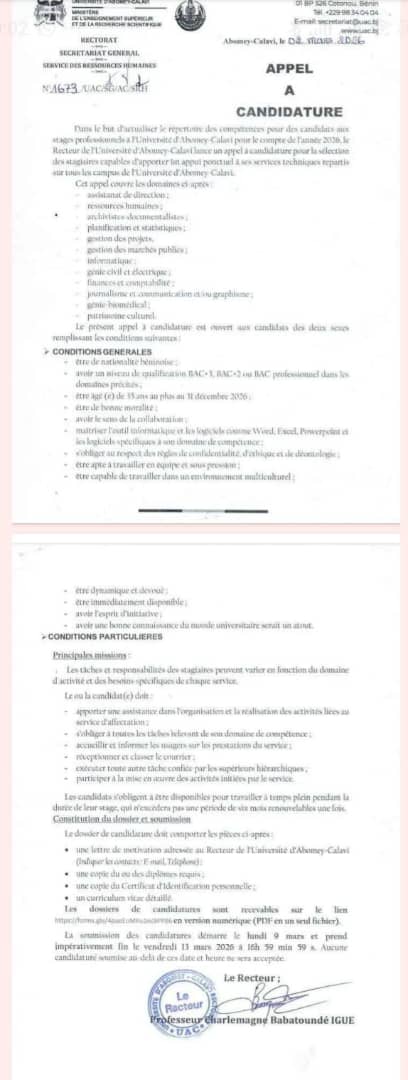 Les dossiers, composés d’une lettre de motivation adressée au Recteur, d’un CV détaillé, des copies de diplômes et du certificat d’identification personnelle, doivent être transmis en un seul fichier PDF via le formulaire en ligne : Répertoire des compétences UAC du 9 au 13 mars 2026 à 16h59 précises. Ci-dessous le communiqué intégral 👇