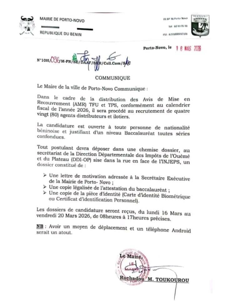 La Mairie de Porto-Novo lance un recrutement de quatre-vingt (80) agents chargés de la distribution des Avis de Mise en Recouvrement (AMR) TFU et TPS dans le cadre du calendrier fiscal 2026.