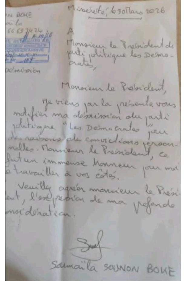 À noter qu’au lendemain de la révision de la constitution en 2025, Soumaïla Sounon Boké avait déjà démissionné avant de revenir sur sa décision le lendemain. Ci-dessous la lettre de démission 👇