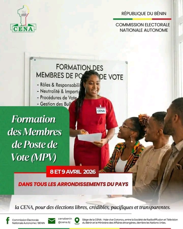 Les membres des postes de vote seront en formation du mercredi 8 au jeudi 9 avril 2026 dans tous les arrondissements du territoire national.