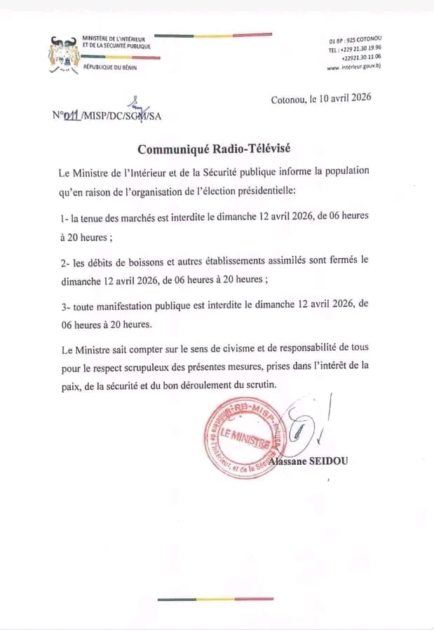 En raison de l’élection présidentielle prévue le dimanche 12 avril 2026, le ministre de l’Intérieur et de la Sécurité publique informe la population béninoise que, de 6 heures à 20 heures, les marchés, les débits de boissons et autres établissements assimilés seront fermés.