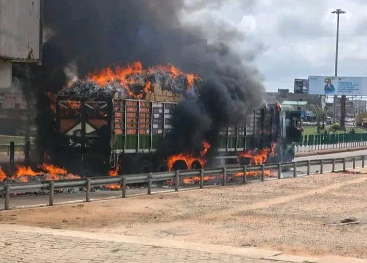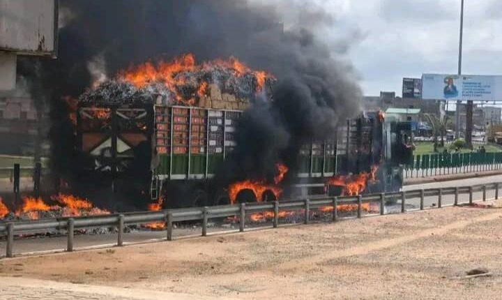 Dans le département de l’Atlantique, précisément à Godomey, dans la commune d’Abomey-Calavi, un camion chargé de bûchettes d’allumettes a pris feu ce mardi 21 avril 2026, aux environs de 12 heures, au niveau de l’échangeur.